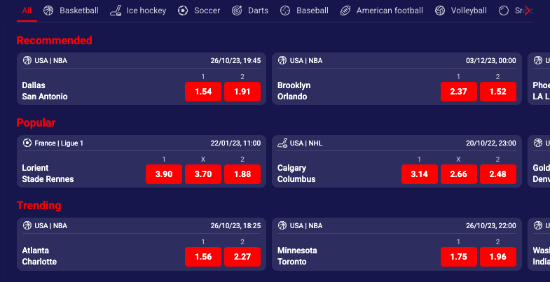 Trending: List of the currently trending items based on the number of recently placed bets (no login required).