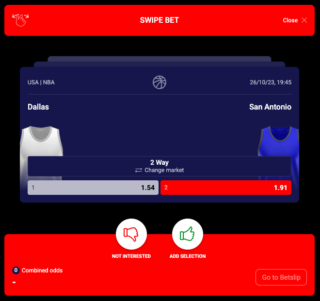 Swipe Bet widget is a front-end widget that provides a personalized betting experience and a fun way for punters to create multi bets. The main feature is the user interface that allows punters to quickly add selections to the bet slip by swiping event cards to the right and removing events they are not interested in by swiping left.
